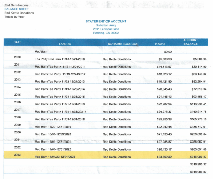 Dick and Frances are private citizens supporting a nonprofit, not a nonprofit themselves. If you're interested in helping, you can purchase five-inch candy canes and drop them off at the Redding Salvation Army at 2691 Larkspur Lane, where 'The Salvation Army' will provide a receipt for your donation. Alternatively, you can bring them directly to their Red Barn; their contact number is (530)-246-9131.